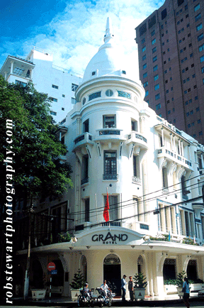 Façade of the Grand Hotel, refurbished French Colonial hotel, with cyclos in foreground.