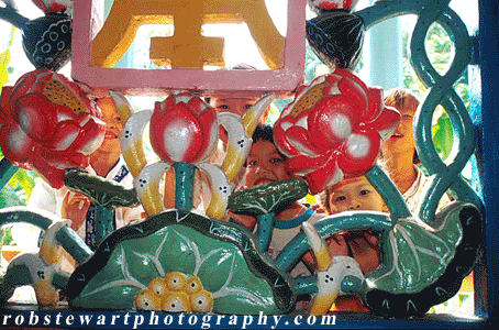 Children peering through lattice window of Cao Dai Temple, Cantho