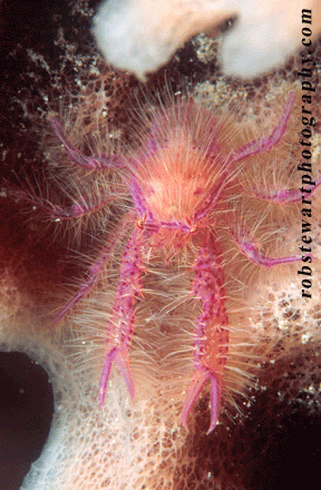 Hairy lobsters live in the grooves of barrel sponges, and can be found with patience, and a keen eye.