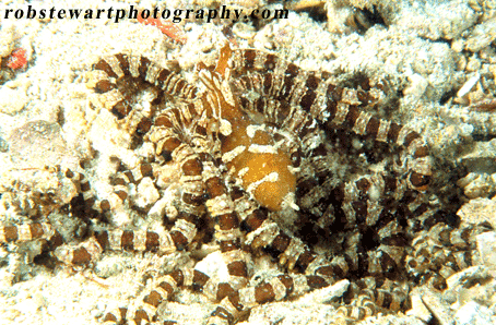 Mimic octypus are elusive cephalopods that are difficult to photograph, because they can disappear underneath, or into virtually anything. Lankayan Island, Malayasian Borneo.