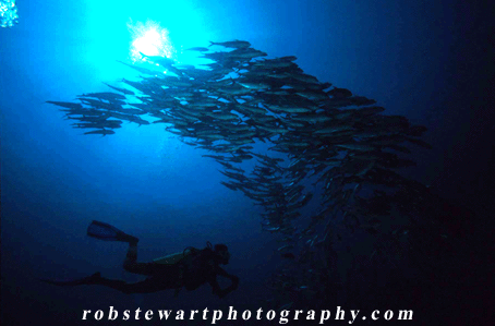 Diver with Chevron Barracuda, Sipadan Island, Malaysian Borneo