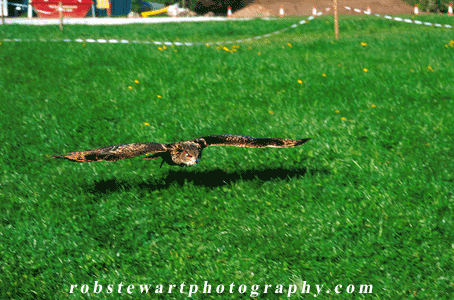 European Eagle Owl. A captive European Eagle Owl performs a flying demonstration