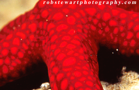 Emperor shrimp are found on the hundreds of starfish beneath the walkways connecting Kapalai's water village buildings.